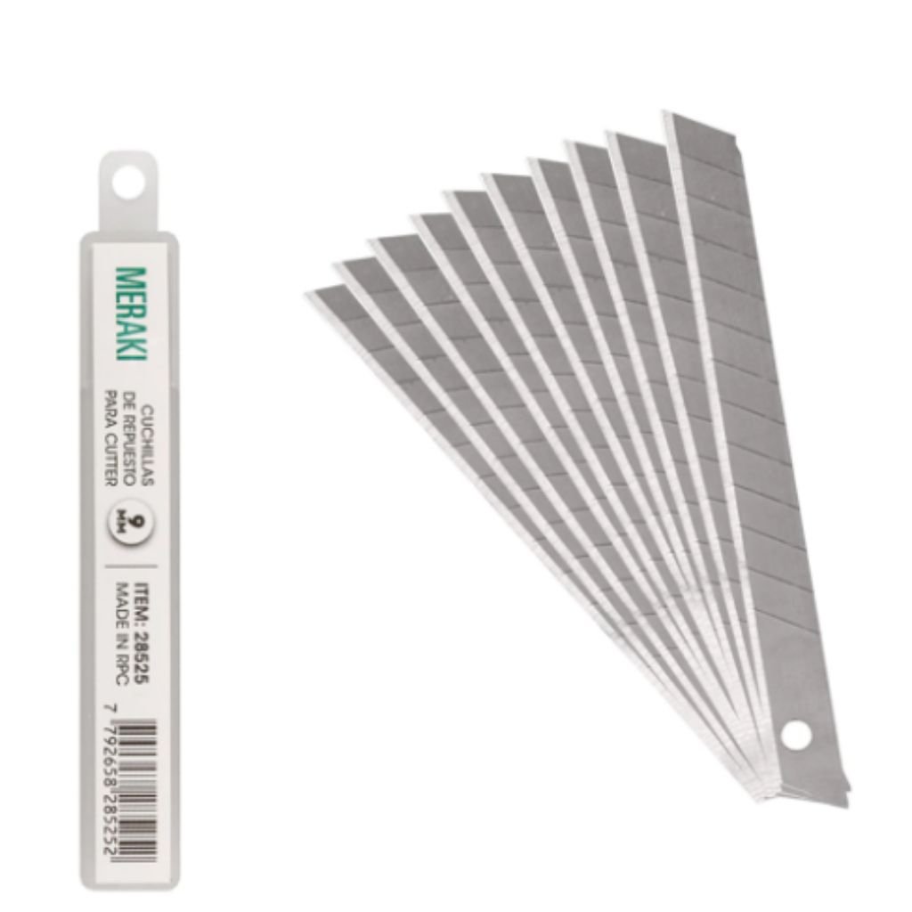 CUTTER MERAKI – Hojas de 9 mm diseñadas para un corte preciso y eficiente en cualquier tipo de trabajo. Son compatibles con cutters de filo angosto, ofreciendo versatilidad para todas tus tareas. Fabricadas con materiales de alta calidad, garantizan resistencia y durabilidad. Su diseño industrial y el sistema de seguridad incorporado brindan mayor confianza durante su uso. Optimiza tu experiencia de corte con meraki.