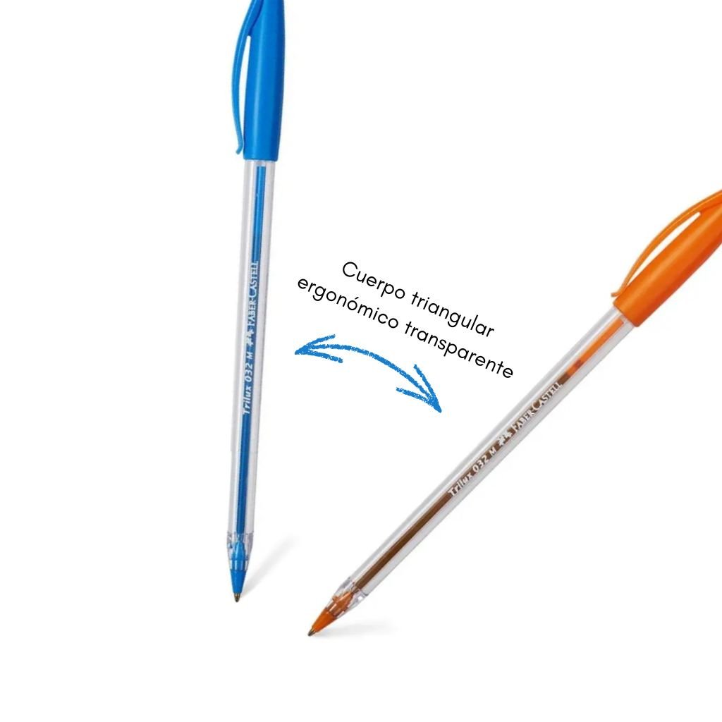 Bolígrafo con cuerpo triangular transparente de tinta seca. Punta metálica media de 1, mm. Tapa con sistema antiasfixia.