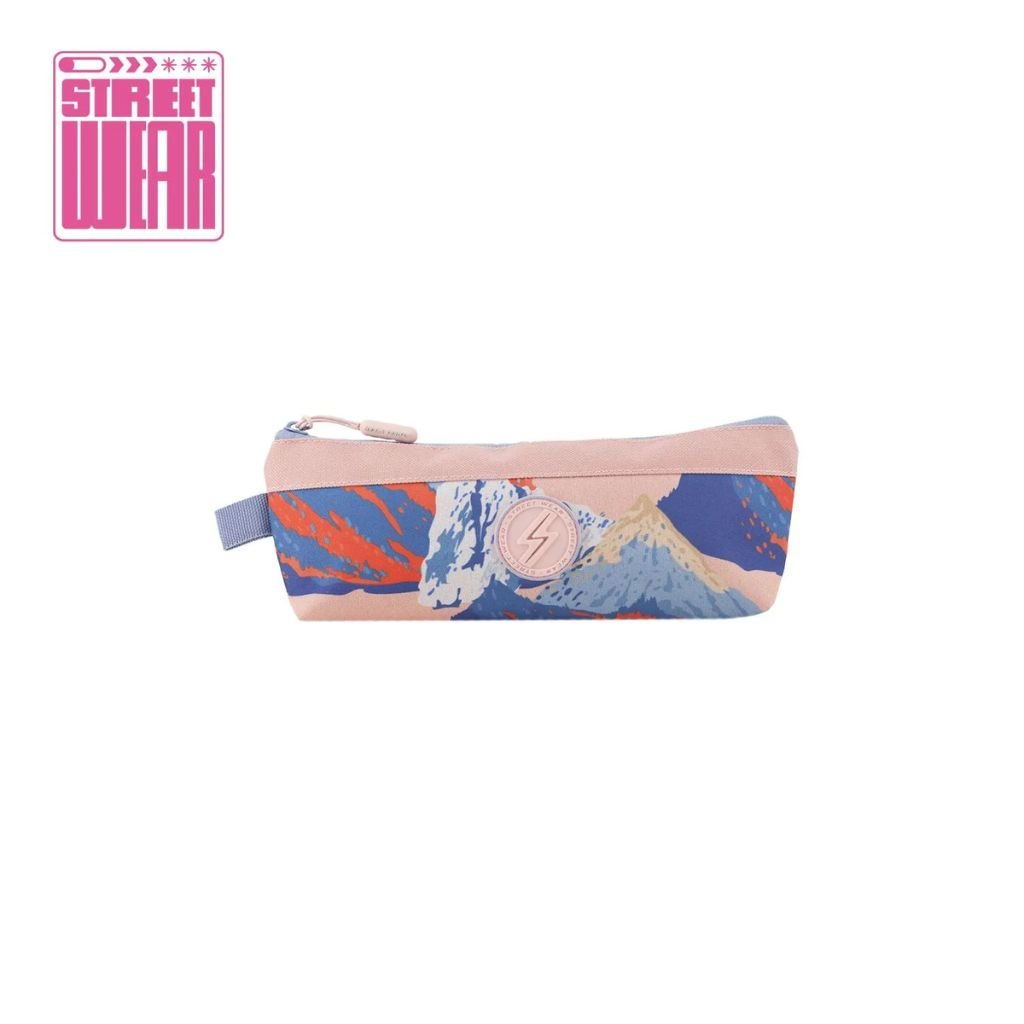 Diseño: Presenta un estampado de paisaje de montaña con nubes y un parche circular frontal con un rayo.