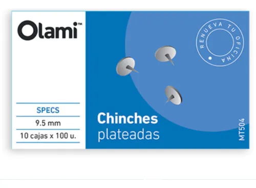 Chinches metálicas de acero con acabado plateado, ideales para sujetar papeles, carteles y notas en pizarras o tableros de manera segura y duradera. Su diseño clásico permite una fijación firme sin dañar los documentos.