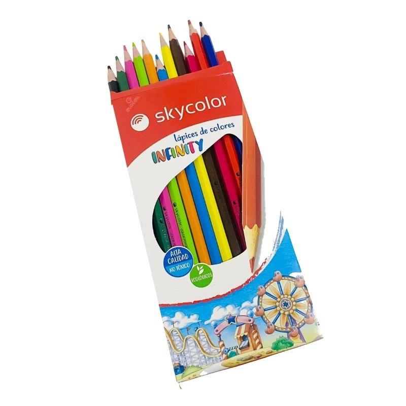 Lapices de colores Skycolor Infinity, de plastico reciclable, flexibles que protegen mejor la punta, puntas resistentes, colores intensos y brillantes. No toxicos. Blister x 12 colores