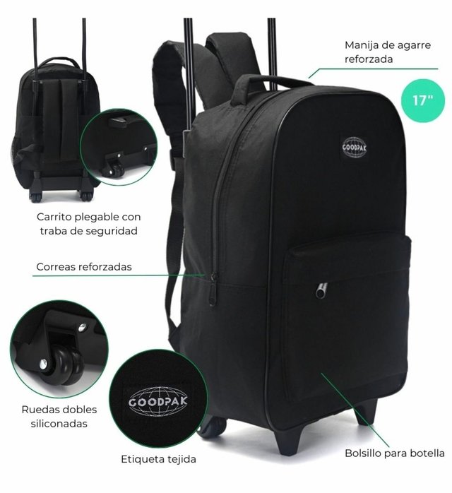 La Mochila Lisa Goodpak Negra es perfecta para cualquier ocasión. Diseñada con dos bolsillos funcionales (superior y frontal) y un bolsillo lateral ideal para tu botella de agua. Su agarre superior y correas reforzadas brindan comodidad y durabilidad. Además, incluye un carrito plegable con traba de seguridad, permitiéndote llevarla cómodamente al hombro o rodarla según tus necesidades. ¡Sencilla, elegante y versátil para tu día a día!