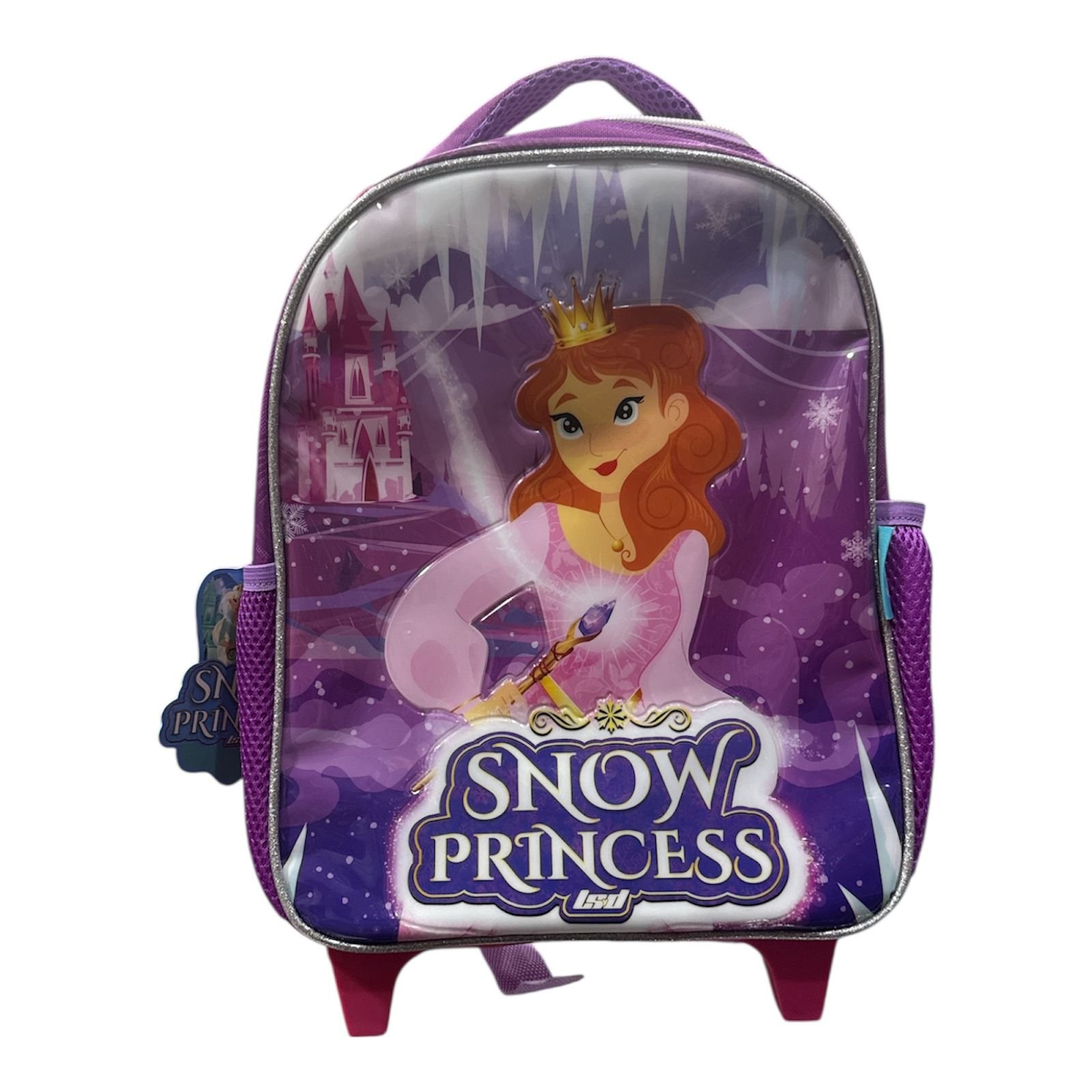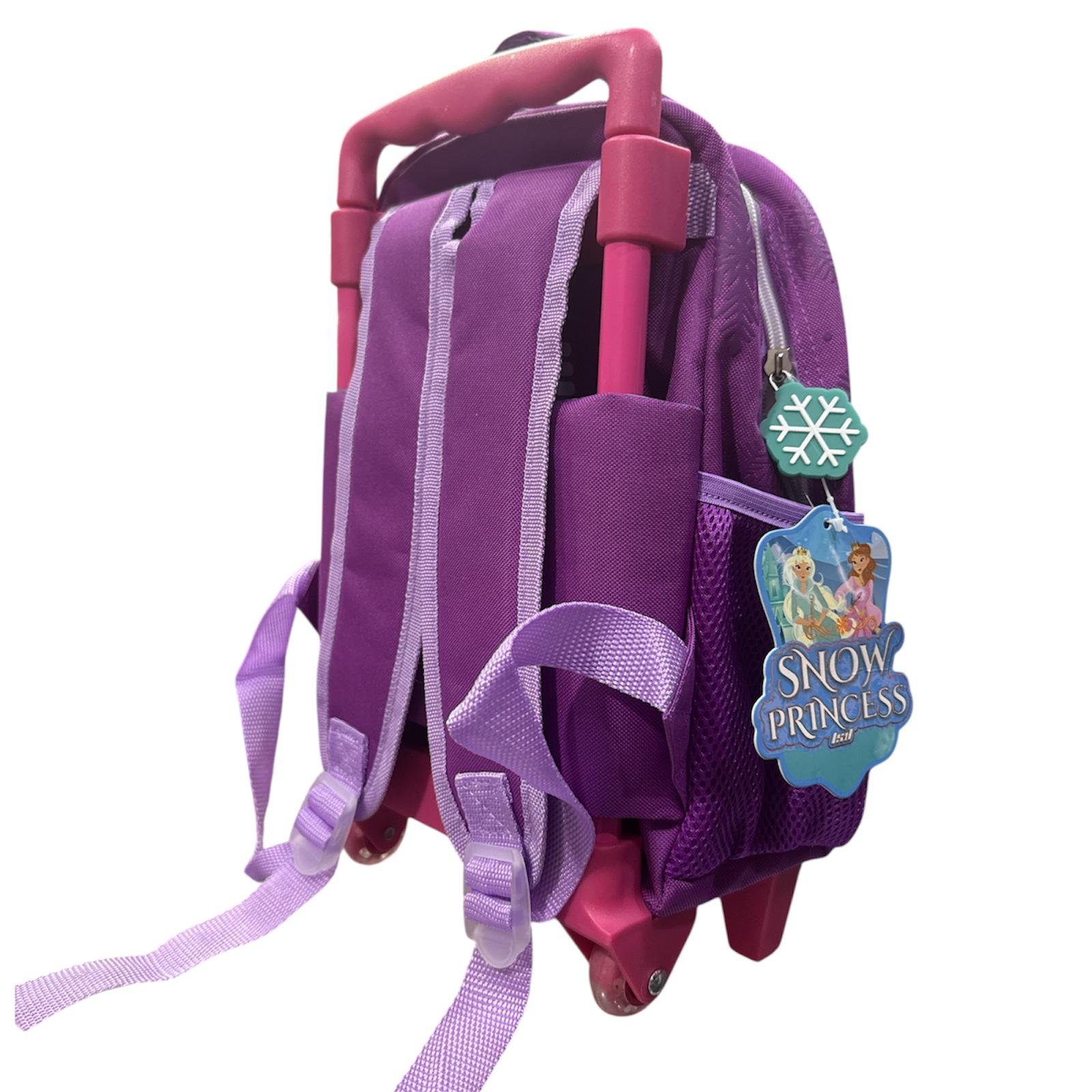 Mochila escolar con diseño de princesas de invierno, ideal para niñas. Incluye carro metálico reforzado, manija extensible y ruedas resistentes. Cuenta con compartimento principal, bolsillo frontal y laterales de red para botellas o accesorios. Ligera, práctica y con un diseño encantador para el uso diario.