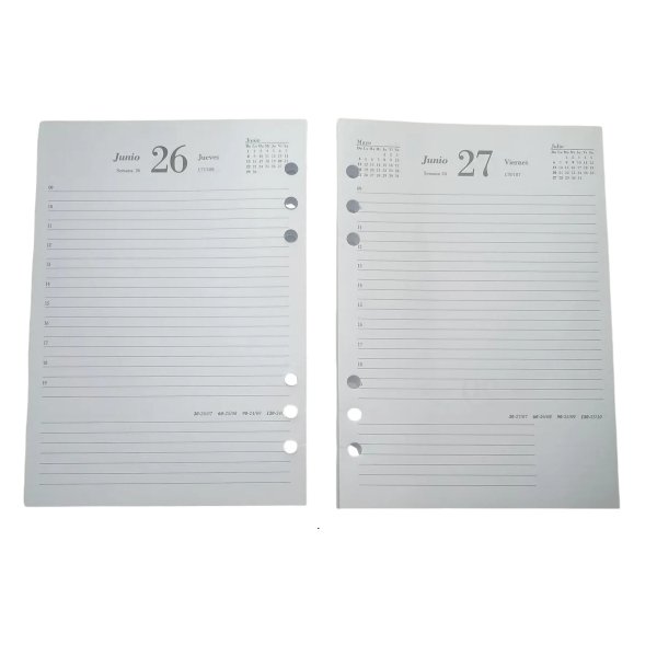 • Perforación de 6 agujeros (la perforación es universal, va en cualquier tapa de agenda anillada)