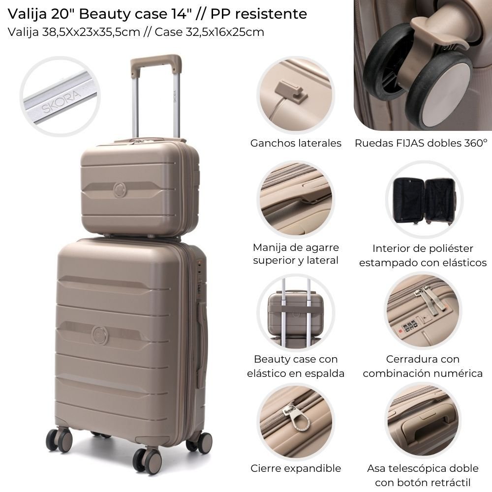 Beauty: interior forrado – Bolsillos internos con cierre organizadores – Asa superior – Tira en el dorso de equipaje – Topes de apoyo en su base – Medidas aproximadas: alto 23 cm, x ancho 29 cm, x profundidad 14 cm.